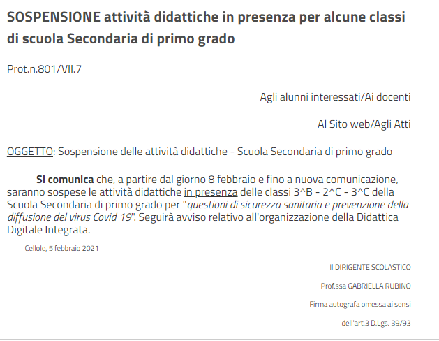 Questo l'avviso pubblicato poco fa sul sito istituzionale dell'Istituto comprensivo Sarao Fermi di Cellole a firma del Dirigente scolastico Gabriella Rubino: "Oggetto: sospensione attività didattiche in presenza per alcune classi di scuola Secondaria di Primo grado. Si comunica - si legge nel documento - che a partire dal giorno 8 febbraio e fino a nuova comunicazione, saranno sospese le attività didattiche in presenza delle classi terza B, seconda C e terza C della Scuola secondaria di primo grado per 'questioni di sicurezza sanitaria - prosegue l'avviso - e prevenzione della diffusione del virus Covid-19'. Seguirà avviso relativo all'organizzazione della Didattica Digitale Integrata". Per vedere l'avviso clicca qui