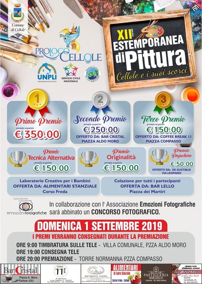 Domenica 1 settembre a Cellole, in provincia di Caserta, si terrà la XII edizione dell'estemporanea di pittura "Cellole e i suoi scorci". La premiazione delle tele avrà luogo alla Torre Normanna di Piazza Compasso alle ore 20:00, con i primi tre primi che spazieranno dai 150 ai 350 euro.