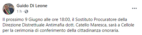 Questo il post pubblicato dal Sindaco di Cellole Guido Di Leone sulla sua pagina Facebook: "Il prossimo 9 Giugno alle ore 18:00, il Sostituto Procuratore della Direzione Distrettuale Antimafia dott. Catello Maresca - si legge nel post - sarà a Cellole per la cerimonia di conferimento della cittadinanza onoraria".