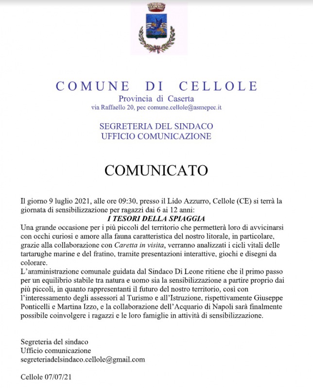 "Il giorno 9 luglio 2021, alle ore 09:30, presso il Lido Azzurro, Cellole (CE) si terrà la giornata di sensibilizzazione per ragazzi dai 6 ai 12 anni: I TESORI DELLA SPIAGGIA. Una grande occasione per i più piccoli del territorio che permetterà- si legge nella nota- loro di avvicinarsi con occhi curiosi e amore alla fauna caratteristica del nostro litorale, in particolare, grazie alla collaborazione con Caretta in visita, verranno analizzati i cicli vitali delle tartarughe marine e del fratino, tramite presentazioni interattive, giochi e disegni da colorare. L’amministrazione comunale guidata dal Sindaco Di Leone ritiene che il primo passo per un equilibrio stabile tra natura e uomo sia la sensibilizzazione a partire proprio dai più piccoli, in quanto rappresentanti il futuro del nostro territorio, così- si legge nella nota- con l’interessamento degli assessori al Turismo e all’Istruzione, rispettivamente Giuseppe Ponticelli e Martina Izzo, e la collaborazione dell’Acquario di Napoli sarà finalmente possibile coinvolgere i ragazzi e le loro famiglie in attività di sensibilizzazione."