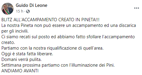 Questo il post pubblicato ieri sulla sua pagina Facebook dal Sindaco di Cellole Guido Di Leone: "BLITZ ALL’ACCAMPAMENTO CREATO IN PINETA!!! La nostra Pineta - si legge nel post - non può essere un accampamento ed una discarica per gli incivili. Ci siamo recati sul posto ed abbiamo fatto sfollare l’accampamento creato. Partiamo con la nostra riqualificazione di quell’area. Oggi è stata fatta liberare. Domani verrà pulita. Settimana prossima - conclude il post - partiamo con l’illuminazione dei Pini. ANDIAMO AVANTI".