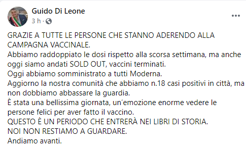 Questo il post pubblicato dal Sindaco di Cellole Guido di Leone sulla sua pagina Facebook: "Grazie a tutte le persone che stanno aderendo alla campagna vaccinale. Abbiamo raddoppiato le dosi - si legge nel post - rispetto alla scorsa settimana, ma anche oggi siamo andati sold out, vaccini terminati. Oggi abbiamo somministrato a tutti Moderna. Aggiorno la nostra comunità che abbiamo n.18 casi positivi in città, ma non dobbiamo abbassare la guardia. È stata una bellissima giornata - prosegue il post - un’emozione enorme vedere le persone felici per aver fatto il vaccino. Questo è un periodo che entrerà nei libri di storia. Noi non restiamo a guardare. Andiamo avanti".