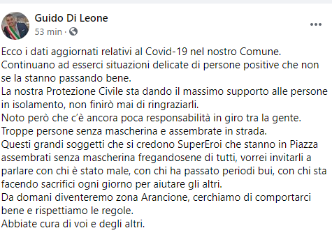 Questo il post pubblicato dal Sindaco di Cellole Guido di Leone sulla sua pagina Facebook: "Ecco i dati aggiornati relativi al Covid-19 nel nostro Comune. Continuano ad esserci situazioni delicate di persone positive che non se la stanno passando bene. La nostra Protezione Civile sta dando il massimo supporto alle persone in isolamento, non finirò mai di ringraziarli. Noto però - prosegue il post - che c’è ancora poca responsabilità in giro tra la gente. Troppe persone senza mascherina e assembrate in strada. Questi grandi soggetti che si credono SuperEroi che stanno in Piazza assembrati senza mascherina fregandosene di tutti, vorrei invitarli a parlare con chi è stato male, con chi ha passato periodi bui, con chi sta facendo sacrifici ogni giorno per aiutare gli altri. Da domani - prosegue il post - diventeremo zona Arancione, cerchiamo di comportarci bene e rispettiamo le regole. Abbiate cura di voi e degli altri".