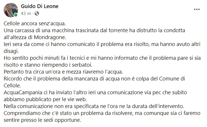 "Cellole ancora senz’acqua. Una carcassa di una macchina trascinata dal torrente ha distrutto la condotta all’altezza di Mondragone. Ieri sera da come ci hanno comunicato il problema era risolto, ma- si legge nella nota- hanno avuto altri disagi. Ho sentito pochi minuti fa i tecnici e mi hanno informato che il problema pare si sia risolto e stanno riempendo i serbatoi. Pertanto tra circa un’ora e mezza riavremo l’acqua. Ricordo che il problema della mancanza di acqua non è colpa del Comune di Cellole. AcquaCampania ci ha inviato l’altro ieri una comunicazione via pec che subito abbiamo pubblicato per le vie web. Nella comunicazione- si legge nella nota- non era specificata ne l’ora ne la durata dell’intervento. Comprendiamo che c’è stato un problema da risolvere, ma comunque sia ci faremo sentire presso le sedi opportune."