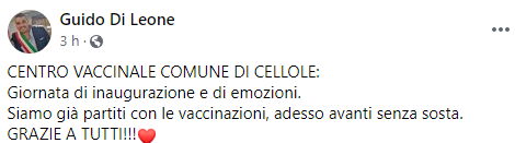 Questo il post pubblicato dal Sindaco di Cellole Guido Di Leone sulla sua pagina Facebook: "Centro vaccinale Comune di Cellole: Giornata di inaugurazione e di emozioni. Siamo già partiti con le vaccinazioni, adesso - conclude il post - avanti senza sosta. Grazie a tutti".