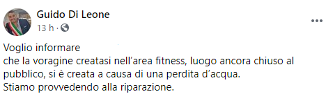 Questo parte del post pubblicato sulla sua pagina Facebook dal Sindaco di Cellole Guido Di Leone: "Voglio (...) che la voragine creatasi nell’area fitness - si legge nel post - luogo ancora chiuso al pubblico, si è creata a causa di una perdita d’acqua. Stiamo provvedendo alla riparazione (...)".