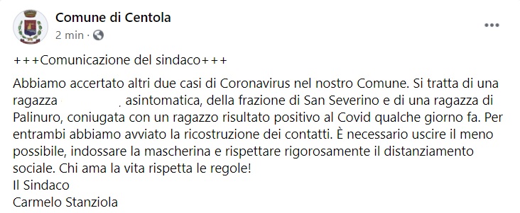 Questo parte di quanto apprendiamo dalla pagina facebook del Comune di Centola: