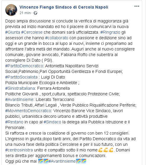 "Dopo ampia discussione si conclude la verifica di maggioranza già prevista ad inizio mandato ed ho il piacere di comunicarvi la nuova Giunta Cercolese che domani sarà ufficializzata. Ringrazio gli assessori che hanno collaborato con passione e dedizione sino ad oggi e un grande in bocca al lupo ai nuovi, insieme ci prepariamo ad affrontare l’altra metà del mandato. Auguri anche al nuovo consigliere comunale, giovane avvocato, Fabiana Roffo che subentra al consigliere Di Dato ( PSI).