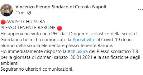 Questo parte il post pubblicato dal Sindaco di Cercola Vincenzo Fiengo sulla sua pagina Facebook: "Ho appena ricevuto una PEC dal Dirigente scolastico della scuola L. Giordano che mi ha comunicato la positività al Covid-19 di un alunno della scuola elementare plesso Tenente Barone. Ho immediatamente disposto la chiusura del Plesso scolastico T.B. - si legge nel post - per la giornata di domani sabato 30.01.2021 e la sanificazione degli ambienti. Seguiranno ulteriori comunicazioni".