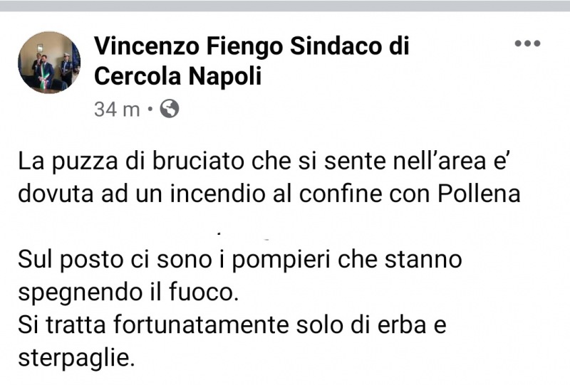 Lo apprendiamo dalla pagina Facebook di Vincenzo Fiengo, Sindaco di Cercola di Napoli.