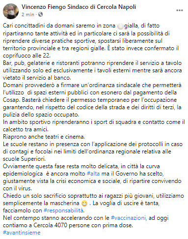 Questo il post pubblicato dal Sindaco di Cercola Vincenzo Fiengo sulla sua pagina Facebook: "Cari concittadini da domani saremo in zona gialla, di fatto ripartiranno tante attività ed in particolare ci sarà la possibilità di riprendere diverse pratiche sportive, spostarsi liberamente sul territorio provinciale e tra regioni gialle. È stato invece confermato il coprifuoco alle 22. Bar, pub, gelaterie e ristoranti - si legge nel post - potranno riprendere il servizio a tavolo utilizzando solo ed esclusivamente i tavoli esterni mentre sarà ancora vietato il servizio al banco. Domani provvederò a firmare un’ordinanza sindacale che permetterà l’utilizzo di spazi esterni pubblici con esonero dal pagamento della Cosap. Basterà chiedere il permesso temporaneo per l’occupazione garantendo, nel rispetto del codice della strada e dei diritti di terzi, la pulizia dello spazio occupato. In ambito sportivo - prosegue il post - riprenderanno i sport di squadra e contatto come il calcetto tra amici. Riaprono anche teatri e cinema. Le scuole restano in presenza con l’applicazione dei protocolli in caso di contagi e focolai nei limiti dell’ordinanza regionale relativa alle scuole Superiori. Ovviamente - si legge ancora nel post - questa fase resta molto delicata, in città la curva epidemiologica è ancora molto alta ma il Governo ha scelto, giustamente vista la crisi economica e sociale, di ripartire convivendo con il virus. Chiedo un solo sacrificio - prosegue il post - soprattutto ai ragazzi più giovani, utilizziamo semplicemente la mascherina. La voglia di uscire è tanta, facciamolo con responsabilità. Nel contempo stanno accelerando con le vaccinazioni, ad oggi - conclude il post - contiamo a Cercola 4070 persone con prima dose".