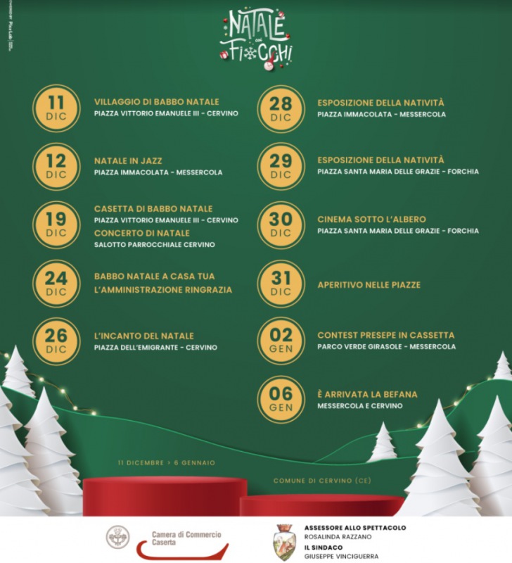 "“NATALE COI FIOCCHI”, IL CALENDARIO DEGLI EVENTI: AL VIA LA PROGRAMMAZIONE DELLE PROSSIME FESTIVITÀ. Partirà sabato 11 dicembre “Natale coi Fiocchi”, la programmazione degli eventi dedicati alle festività natalizie, che si svolgeranno tra Cervino, Messercola e Forchia fino al 6 gennaio 2022: lo annunciano il sindaco Giuseppe Vinciguerra e l’assessore allo Spettacolo Rosalinda Razzano. Il calendario, ricco di iniziative e manifestazioni- si legge nella nota- per tutte le fasce di età, è stato stilato e promosso dall’Amministrazione, in collaborazione con le Associazioni attive sul territorio comunale. La serata inaugurale avrà luogo in Piazza Vittorio Emanuele III, a Cervino, e andrà a ricreare, da subito, la magica atmosfera delle Feste, con l’allestimento di un “Villaggio di Babbo Natale” caratterizzato da gonfiabili, animazione, personaggi Disney e tante altre sorprese, soprattutto per i bambini. Si proseguirà con la musica domenica 12 dicembre, a Messercola, e domenica 19 dicembre, a Cervino, rispettivamente con “Natale in Jazz”, a cura di Antonio Bocchino e della sua Band, e con il “Concerto di Natale”, presentato dalla Start Music Academy del maestro Daniele Dogali e a cura della Start One Ensamble, diretta dal maestro Massimo Stabile. Domenica 19 dicembre, inoltre, a cura dell’Associazione “Liberamente”, ci saranno altri due appuntamenti a Cervino, a partire dalla mattina: la visita alla “Casetta di Babbo Natale” e, patrocinato dal Comune, l’accompagnamento musicale della “Banda dei Babbo Natale”. Vigilia riservata alla consegna dei regali, con “Babbo Natale a Casa Tua”, come da tradizione delle Associazioni locali, e una festa- si legge nella nota- che il Sindaco e l’Amministrazione Comunale regaleranno ai cittadini, per ringraziare la comunità e procedere con uno scambio di auguri collettivo. Si proseguirà domenica 26 dicembre, in Piazza dell’Emigrante, con “L’incanto del Natale”, dove, a cura dell’Associazione “Genitori Uniti”, si metterà in scena una rappresentazione vivente della Natività e, contestualmente, la sua narrazione; martedì 28 e mercoledì 29 dicembre, “Esposizione della Natività” a Forchia, con la sola rappresentazione dei figuranti. Giovedì 30 dicembre sarà la volta del “Cinema sotto l’Albero”, con proiezioni all’aperto a cura dell’Associazione “E.state Insieme”; venerdì 31, Vigilia di Capodanno, si procederà con “Aperitivo nelle Piazze”, per chiudere il 2021 con un brindisi. Le ultime due giornate in programma saranno domenica 2 gennaio, con il contest natalizio “Presepe in Cassetta”, a cura dell’Associazione parrocchiale “Il Girasole”, e giovedì 6 gennaio con un ritorno in piazza, a Cervino, per “È arrivata la Befana”, a cura della Pro Loco Cervino e della Pro Loco Messercola- Forchia. “Siamo soddisfatti del programma e degli eventi che andremo a realizzare su tutto il territorio comunale – ha dichiarato l’assessore Rosalinda Razzano, congiuntamente al Sindaco – che avranno la capacità di coinvolgere grandi e piccoli in un’atmosfera magica, tipica delle festività natalizie. I tempi stretti per i contatti e l’organizzazione non ci hanno consentito di presentare un calendario ancora più ricco di iniziative, ma riteniamo anche che sia un bene ridurre il numero degli eventi pubblici per ragioni di sicurezza. Chiediamo, fin da ora, la massima cooperazione da parte dei cittadini per un Natale gioioso, ma anche all’insegna- si legge nella nota- della responsabilità. Un ringraziamento va fatto sicuramente alle Associazioni attive sul territorio, che hanno lavorato in stretta collaborazione con l’Amministrazione Comunale, garantendo un supporto fondamentale e costante”."