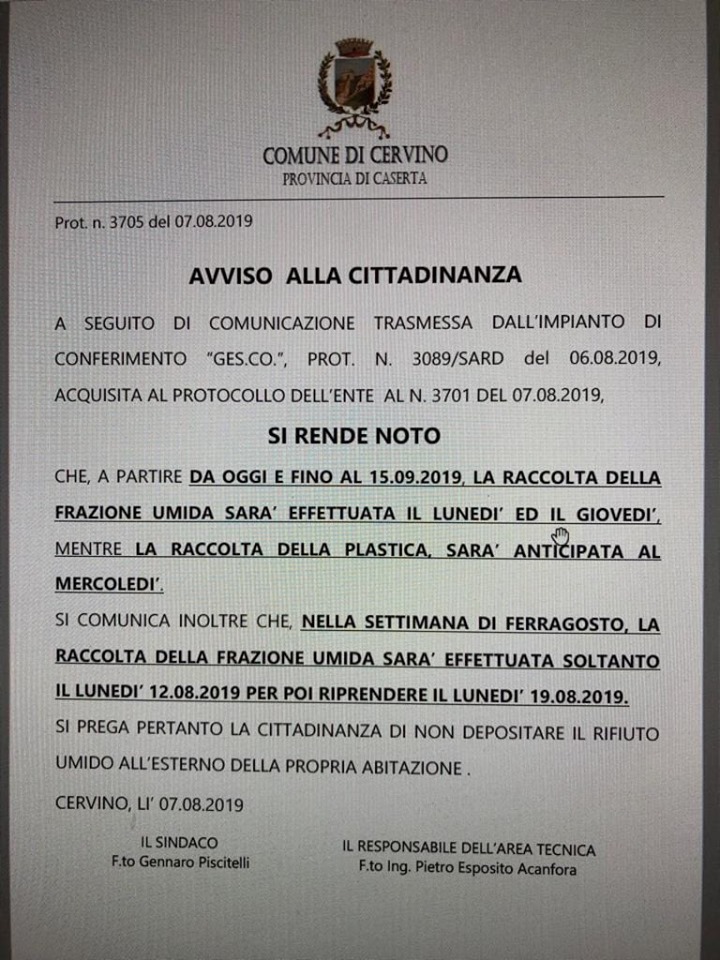 Cambiano i giorni di raccolta della frazione umida e della plastica al Comune di Cervino