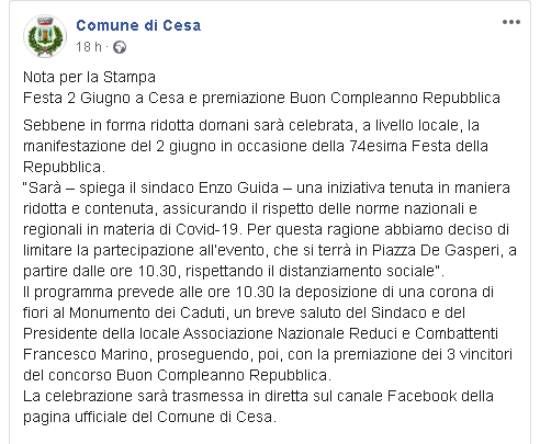 Sebbene in forma ridotta domani sarà celebrata, a livello locale, la manifestazione del 2 giugno in occasione della 74esima Festa della Repubblica. “Sarà – spiega il sindaco Enzo Guida – una iniziativa tenuta in maniera ridotta e contenuta, assicurando il rispetto delle norme nazionali e regionali in materia di Covid-19. Per questa ragione abbiamo deciso di limitare la partecipazione all’evento, che si terrà in Piazza De Gasperi, a partire dalle ore 10.30, rispettando il distanziamento sociale”. Il programma prevede alle ore 10.30 la deposizione di una corona di fiori al Monumento dei Caduti, un breve saluto del Sindaco e del Presidente della locale Associazione Nazionale Reduci e Combattenti Francesco Marino, proseguendo, poi, con la premiazione dei 3 vincitori del concorso Buon Compleanno Repubblica. La celebrazione sarà trasmessa in diretta sul canale Facebook della pagina ufficiale del Comune di Cesa."
