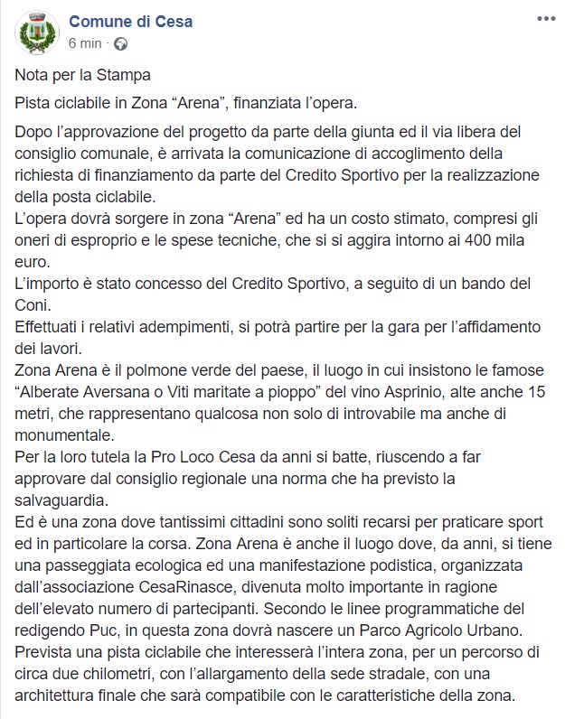 Questo quanto apprendiamo dalla pagina FB del Comune di Cesa