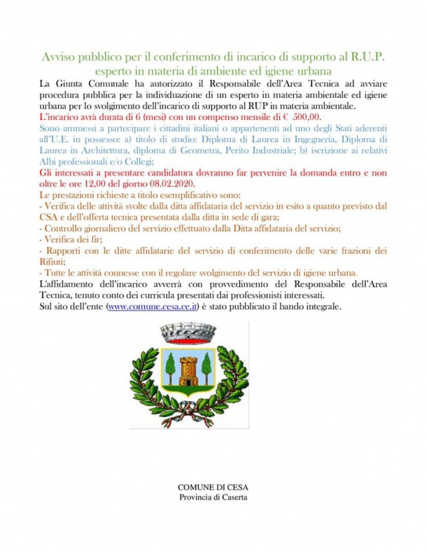 "Avviso selezione esperto in materia di ambiente ed igiene urbana".