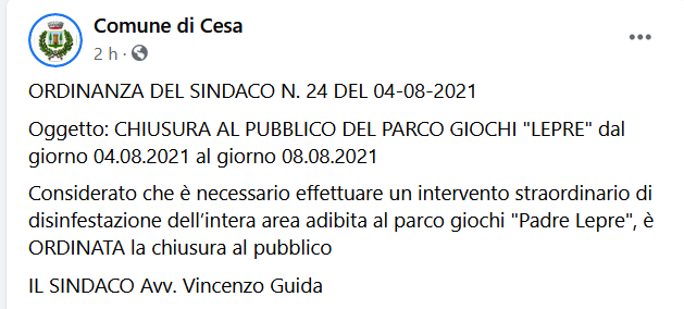 Questo il post pubblicato sulla pagina Facebook del Comune di Cesa: "ORDINANZA DEL SINDACO N. 24 DEL 04-08-2021