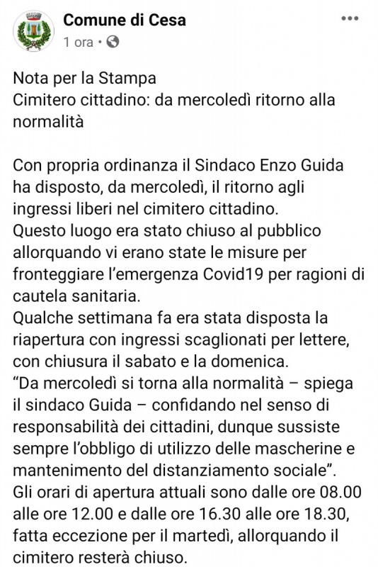 Gli orari di apertura attuali sono dalle ore 08.00 alle ore 12.00 e dalle ore 16.30 alle ore 18.30, fatta eccezione per il martedì, allorquando il cimitero resterà chiuso."