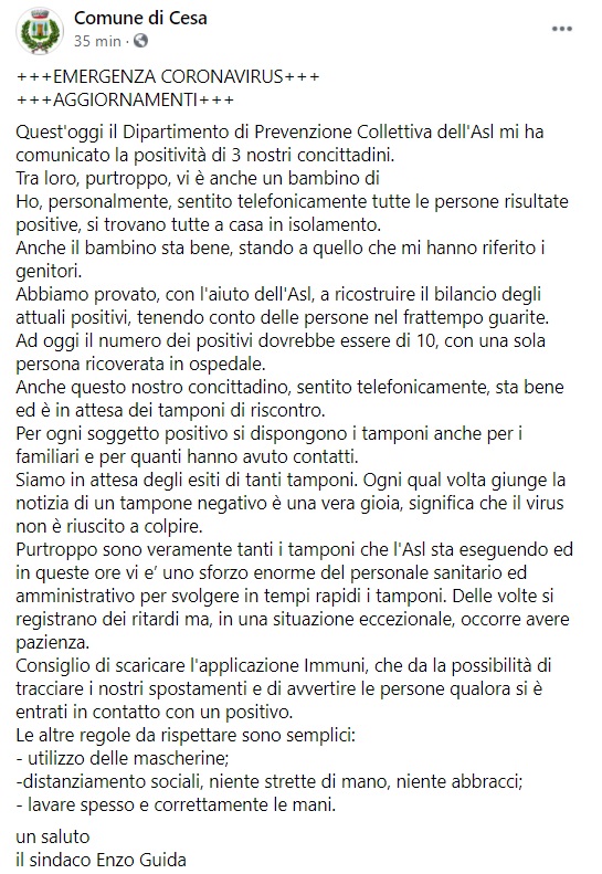 Questo parte di quanto pubblicato sulla pagina facebook del Comune di Cesa: