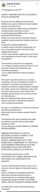 Si tratta del genitore della nostra concittadina risultata positiva domenica scorsa. In questa situazione difficile, però, ci sono anche NOTIZIE POSITIVE. Sempre ieri sera è giunto l’esito del tampone eseguito sul primo paziente risultato positivo a Cesa.