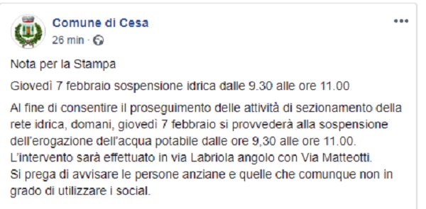 Questo il post pubblicato sulla pagina fb ufficiale del Comune di Cesa.