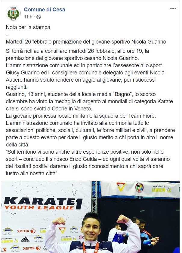 A 13 anni si laurea campione del mondo di karate, e i riconoscimenti per il giovane Nicola Guarino non finiscono qui.