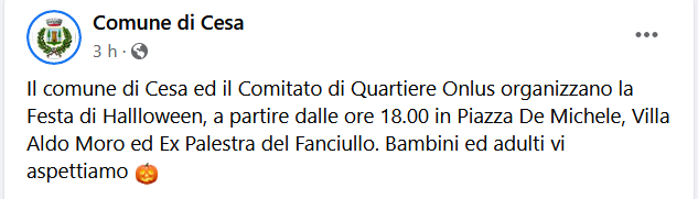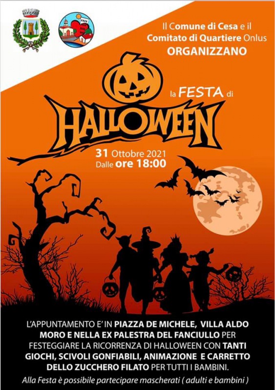 Questo il post pubblicato sulla pagina Facebook del Comune di Cesa: "Il comune di Cesa ed il Comitato di Quartiere Onlus organizzano la Festa di Halloween, a partire dalle ore 18.00 in Piazza De Michele, Villa Aldo Moro ed Ex Palestra del Fanciullo. Bambini ed adulti vi aspettiamo - conclude il post".