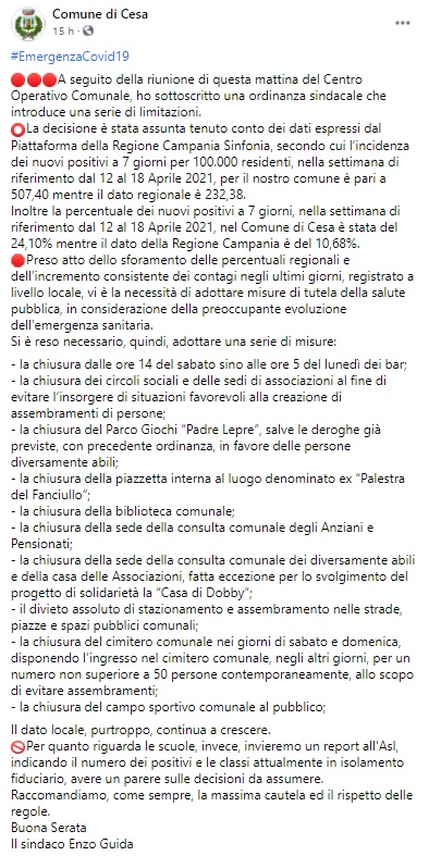 Questo quanto apprendiamo dalla pagina fb del Comune di Cesa: "A seguito della riunione di questa mattina del Centro Operativo Comunale, ho sottoscritto una ordinanza sindacale che introduce una serie di limitazioni. La decisione - si legge nella nota - è stata assunta tenuto conto dei dati espressi dalla Piattaforma della Regione Campania Sinfonia, secondo cui l’incidenza dei nuovi positivi a 7 giorni per 100.000 residenti, nella settimana di riferimento dal 12 al 18 Aprile 2021, per il nostro comune è pari a 507,40 mentre il dato regionale è 232,38. Inoltre la percentuale dei nuovi positivi a 7 giorni, nella settimana di riferimento dal 12 al 18 Aprile 2021, nel Comune di Cesa è stata del 24,10% mentre il dato della Regione Campania è del 10,68%. Preso atto dello sforamento delle percentuali regionali e dell’incremento consistente dei contagi negli ultimi giorni, registrato a livello locale, vi è la necessità di adottare misure di tutela della salute pubblica - si legge nella nota -, in considerazione della preoccupante evoluzione dell’emergenza sanitaria. Si è reso necessario, quindi, adottare una serie di misure: - la chiusura dalle ore 14 del sabato sino alle ore 5 del lunedì dei bar; - la chiusura dei circoli sociali e delle sedi di associazioni al fine di evitare l’insorgere di situazioni favorevoli alla creazione di assembramenti di persone; - la chiusura del Parco Giochi “Padre Lepre”, salve le deroghe già previste, con precedente ordinanza, in favore delle persone diversamente abili; - la chiusura della piazzetta interna al luogo denominato ex “Palestra del Fanciullo”; - la chiusura della biblioteca comunale; - la chiusura della sede della consulta comunale degli Anziani e Pensionati; - la chiusura della sede della consulta comunale dei diversamente abili e della casa delle Associazioni, fatta eccezione per lo svolgimento del progetto di solidarietà la “Casa di Dobby”; - il divieto assoluto di stazionamento e assembramento nelle strade, piazze e spazi pubblici comunali; - la chiusura del cimitero comunale nei giorni di sabato e domenica - si legge nella nota -, disponendo l’ingresso nel cimitero comunale, negli altri giorni, per un numero non superiore a 50 persone contemporaneamente, allo scopo di evitare assembramenti; - la chiusura del campo sportivo comunale al pubblico; Il dato locale, purtroppo, continua a crescere. Per quanto riguarda le scuole, invece, invieremo un report all'Asl, indicando il numero dei positivi e le classi attualmente in isolamento fiduciario, avere un parere sulle decisioni da assumere. Raccomandiamo, come sempre, la massima cautela ed il rispetto delle regole - si legge nella nota -. Buona Serata Il sindaco Enzo Guida".