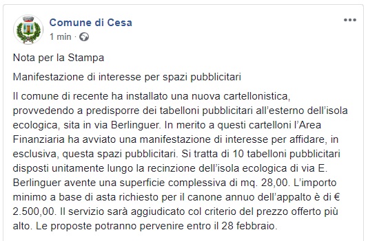 Apprendiamo dalla pagina Fb del Comune di Cesa quanto segue