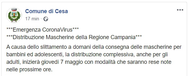 Questo quanto comunicato dalla pagina fb del Comune di Cesa