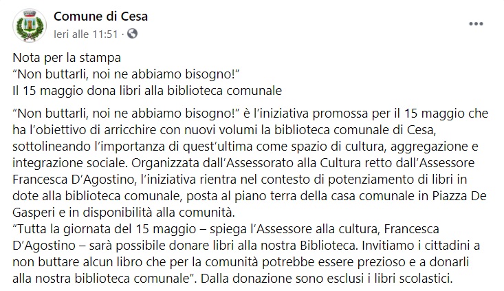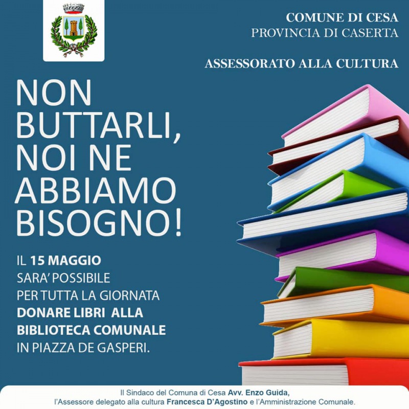"Nota per la stampa “Non buttarli, noi ne abbiamo bisogno!” Il 15 maggio dona libri alla biblioteca comunale “Non buttarli, noi ne abbiamo bisogno!” è l’iniziativa promossa per il 15 maggio che ha l’obiettivo di arricchire con nuovi volumi la biblioteca comunale di Cesa, sottolineando l’importanza di quest’ultima come spazio di cultura, aggregazione e integrazione sociale. -Si legge nella nota- Organizzata dall’Assessorato alla Cultura retto dall’Assessore Francesca D’Agostino, l’iniziativa rientra nel contesto di potenziamento di libri in dote alla biblioteca comunale, posta al piano terra della casa comunale in Piazza De Gasperi e in disponibilità alla comunità. -Si legge nella nota- “Tutta la giornata del 15 maggio – spiega l’Assessore alla cultura, Francesca D’Agostino – sarà possibile donare libri alla nostra Biblioteca. Invitiamo i cittadini a non buttare alcun libro che per la comunità potrebbe essere prezioso e a donarli alla nostra biblioteca comunale”. Dalla donazione sono esclusi i libri scolastici."