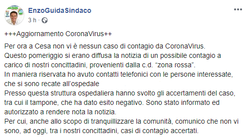 Per ora a Cesa non vi è nessun caso di contagio da CoronaVirus. Questo pomeriggio si erano diffusa la notizia di un possibile contagio a carico di nostri concittadini, provenienti dalla c.d. “zona rossa”. In maniera riservata ho avuto contatti telefonici con le persone interessate, che si sono recate all’ospedale ... Presso questa struttura ospedaliera hanno svolto gli accertamenti del caso, tra cui il tampone, che ha dato esito negativo. Sono stato informato ed autorizzato a rendere nota la notizia. Per cui, anche allo scopo di tranquillizzare la comunità, comunico che non vi sono, ad oggi, tra i nostri concittadini, casi di contagio accertati."