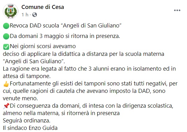 "Revoca DAD scuola “Angeli di San Giuliano”. Da domani 3 maggio si ritorna in presenza. Nei giorni scorsi avevamo deciso di applicare la didattica a distanza per la scuola materna “Angeli di San Giuliano”. La ragione era legata al fatto che 3 alunni erano in isolamento ed in attesa di tampone. Fortunatamente- si legge nella nota- gli esisti dei tamponi sono stati tutti negativi, per cui, quelle ragioni di cautela che avevano imposto la DAD, sono venute meno. Di conseguenza da domani, di intesa con la dirigenza scolastica, almeno nella materna, si ritornerà in presenza Seguirà ordinanza. Il sindaco Enzo Guida"