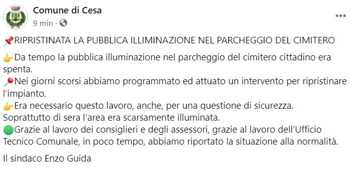 Questo quanto apprendiamo dalla pagina facebook del Comune di Cesa: