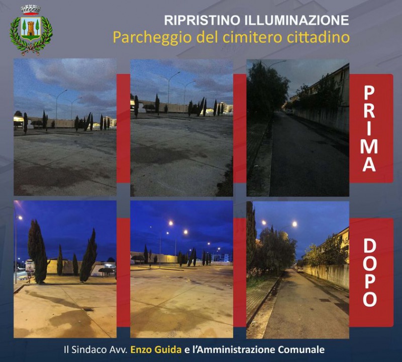Da tempo la pubblica illuminazione nel parcheggio del cimitero cittadino era spenta. Nei giorni scorsi abbiamo programmato ed attuato un intervento per ripristinare l’impianto. Era necessario questo lavoro, anche, per una questione di sicurezza. Soprattutto di sera l’area- si legge nella nota- era scarsamente illuminata. Grazie al lavoro dei consiglieri e degli assessori, grazie al lavoro dell’Ufficio Tecnico Comunale, in poco tempo, abbiamo riportato la situazione alla normalità.