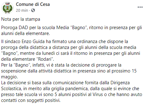 Questo il post pubblicato sulla pagina Facebook 'Comune di Cesa': "Nota per la stampa. Proroga DAD per la scuola Media “Bagno”, ritorno in presenza per gli alunni della elementare. Il sindaco Enzo Guida ha firmato una ordinanza che dispone la proroga della didattica a distanza per gli alunni della scuola media “Bagno”, mentre - si legge nel post - da lunedì ci sarà il ritorno in presenza per gli alunni della elementare “Rodari”. Per la “Bagno”, infatti, vi è stata la decisione di prorogare la sospensione dalla attività didattica in presenza sino al prossimo 15 maggio. La decisione - si legge nel post - si basa sulla comunicazione fornita dalla Dirigenza Scolastica, in merito alla griglia pandemica, dalla quale si evince che presso tale scuola vi sono 5 alunni positivi al Virus o che hanno avuto contatti con soggetti positivi".