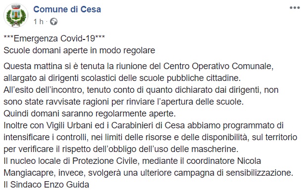 Cesa. "SCUOLE domani aperte in modo regolare. Non ravvisate ragioni per rinviare apertura"