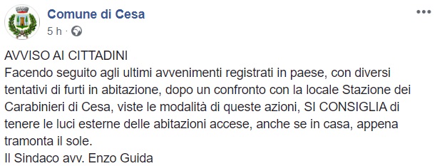 Questo quanto appreso dalla pagina Facebook del Comune di Cesa: