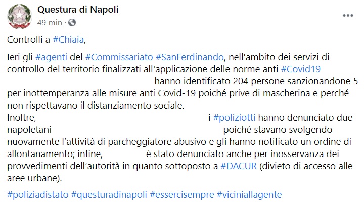 "Controlli a #Chiaia, .... Ieri gli #agenti del #Commissariato #SanFerdinando, nell'ambito dei servizi di controllo del territorio finalizzati all'applicazione delle norme anti #Covid19 ..., hanno identificato 204 persone sanzionandone 5 per inottemperanza alle misure anti Covid-19 poiché- si legge nella nota- prive di mascherina e perché non rispettavano il distanziamento sociale. Inoltre, ... i #poliziotti hanno denunciato due napoletani ... poiché stavano svolgendo nuovamente l’attività di parcheggiatore abusivo e gli hanno notificato un ordine di allontanamento; infine, ... è stato- si legge nella nota- denunciato anche per inosservanza dei provvedimenti dell’autorità in quanto sottoposto a #DACUR (divieto di accesso alle aree urbane)."