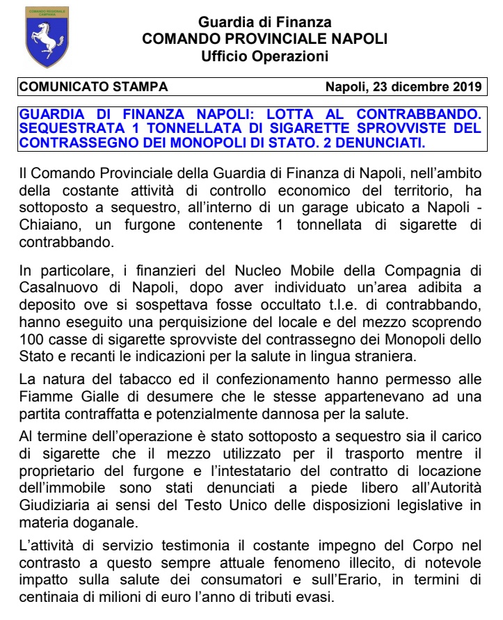 Pubblichiamo nota stampa della GDF Napoli