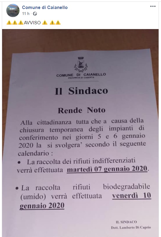Questo quanto apprendiamo dalla pagina FB del Comune di Caianello