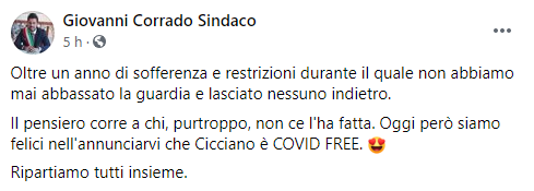 Questo il post pubblicato sulla sua pagina Facebook dal Sindaco di Cicciano Giovanni Corrado: "Oltre un anno di sofferenza e restrizioni durante il quale non abbiamo mai abbassato la guardia e lasciato nessuno indietro. Il pensiero corre - si legge nel post - a chi, purtroppo, non ce l'ha fatta. Oggi però - conclude il post - siamo felici nell'annunciarvi che Cicciano è COVID FREE. Ripartiamo tutti insieme".