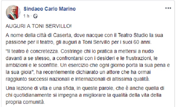 Questo il post pubblicato sulla bachece fb ufficiale del Sindaco di Caserta Carlo Marino.