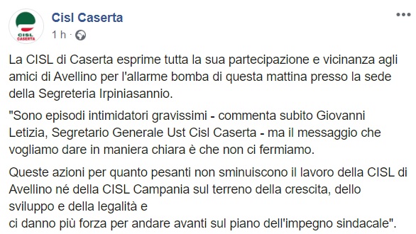 Questo quanto pubblicato sulla pagina facebook di Cisl Caserta: