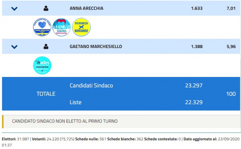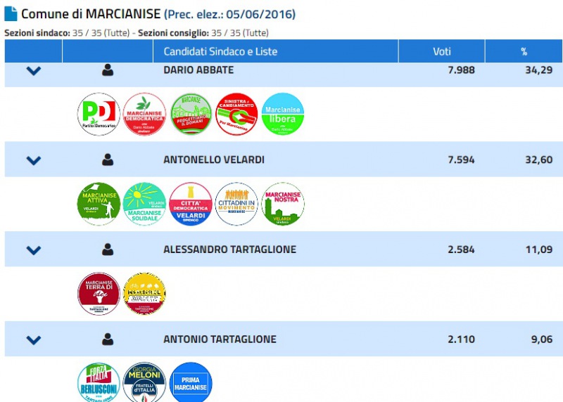 Terminato lo scrutinio delle Comunali a Marcianise, dati sul sito del Ministero. Sarà ballottaggio tra Dario Abbate (34%) e Antonello Velardi (32%). Di seguito tutte le preferenze.