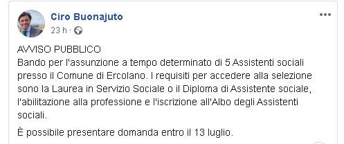 Lo apprendiamo dalla pagina Facebook di Ciro Buonajuto, Sindaco di Ercolano: