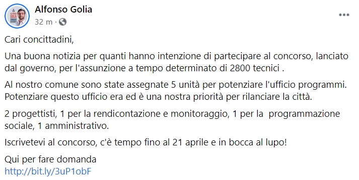 Questo quanto pubblicato sulla pagina fb del Sindaco Golia: "Cari concittadini, Una buona notizia per quanti hanno intenzione di partecipare al concorso, lanciato dal governo, per l'assunzione a tempo determinato di 2800 tecnici. Al nostro comune sono state assegnate 5 unità - si legge nella nota - per potenziare l'ufficio programmi. Potenziare questo ufficio era ed è una nostra priorità per rilanciare la città. 2 progettisti, 1 per la rendicontazione e monitoraggio, 1 per la programmazione sociale, 1 amministrativo. Iscrivetevi al concorso, c'è tempo fino al 21 aprile e in bocca al lupo! Qui per fare domanda CLICCA QUI".