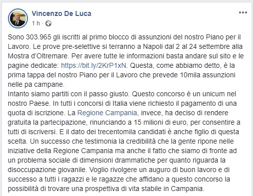 Questo quanto scritto dal Presidente della Regione Campania Vincenzo De Luca sul proprio profilo FB
