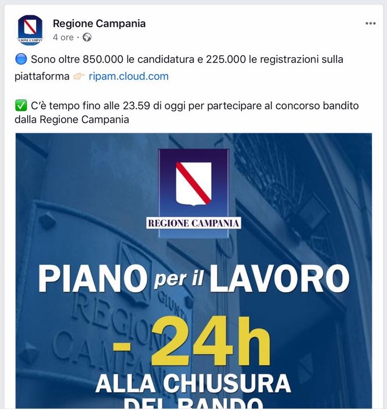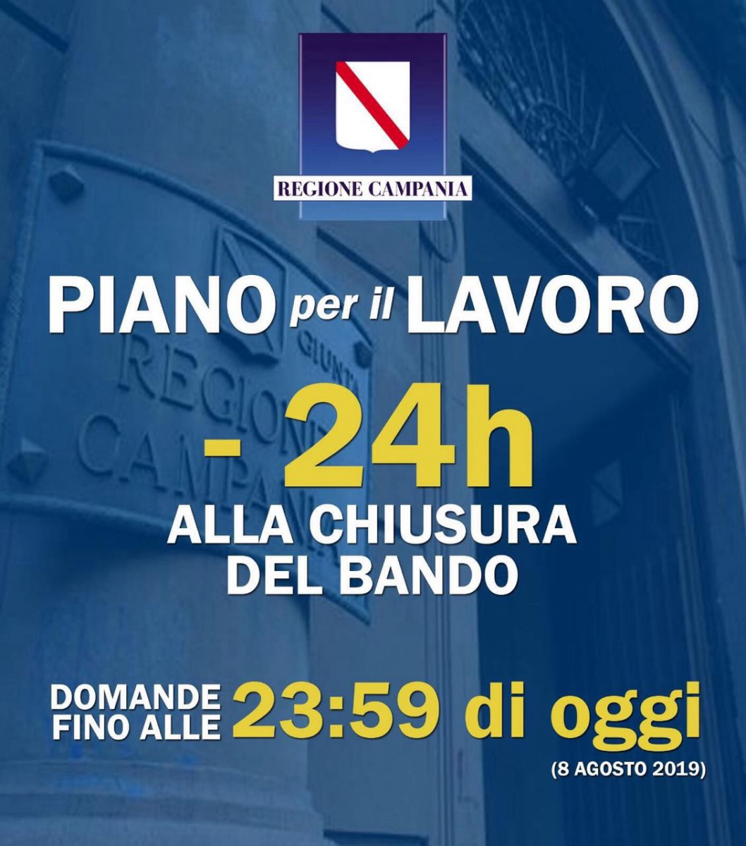Questo quanto apprendiamo dal profilo FB della Regione Campania. Il bando scade oggi (8 agosto 2019) e bisogna iscriversi entro le ore 23:59.