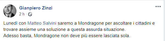 Questo il post pubblicato su Facebook dal Consigliere Regionale della Campania Giampiero Zinzi: